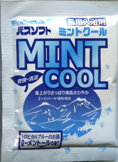 4袋入り98円!の激安クール系入浴剤。湯に投入するとやや薄いブルーに。湯色名は「トロピカルブルー」とあるがむしろ薄い絵の具色と言ったほうが的確であろう。香りは典型的なサロンパス臭だがすぐに弱くなる。湯ざわりはギシギシっとした感覚で爽快感はない。湯上りの温浴感があまりないのはクール系としては幸いだが肌はサラサラと言うよりカサツキを感じた。(by あるびの所長)