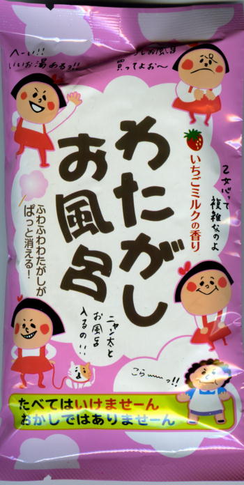 わたがしのような姿の超キワモノ入浴剤。パッケージを開けると少し圧縮されたピンク色のわたがしが姿を現す。割ってみると中は赤色が濃く粉末状の物質がサンドされている。原材料「トレハロース/水飴」って、「わたがし」そのものなんじゃ・・・?少しずつちぎって湯に入れよう・・・と思うと溶けて指にこびりつき血の滴る肉塊のように(怖)。湯に入れるとパッ!と驚くほど一瞬で溶ける。湯色はクリアな赤色、香りは「いちごミルク」とあるが、カキ氷のシロップとしか思えない強い香り。強度・持続性とも良いがややキツめで雑な香りなのでリラックスは誘わない。湯ざわりはあまり変化がなく、湯上り肌もあまり保湿感を感じられずカサツキがある。非常に興味をそそる商品であったが効能は不満足。凝った成分配合に定評のある石澤研究所、これはいくらなんでも遊びに走りすぎたか。配合成分の再考が課題であろう。(by あるびの所長)