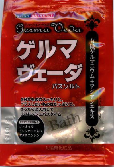 香りは「バス○リン」のような香りでした。水色は透明な朱色。「ごま油」が入っていると言うのがすごくビックリでした。でも何の効果なんでしょうか?ごまは身体にいいし、油はお肌にいいし・・・?ゲルマ効果はあんまり感じられなかったように思うです。少しは温浴感はありましたけど、汗かいたりはしなかったです。「ヴィーダ」ってなんなんでしょうかね?(by 研究員すらい) | ||||